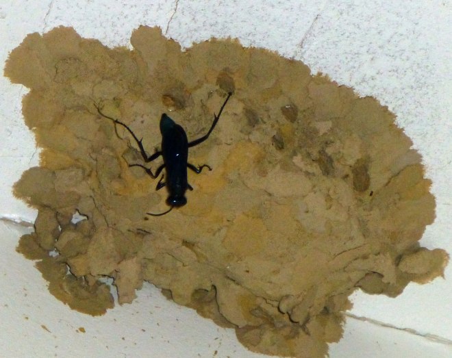 I was able to watch a blue mud dauber, (Chalybion californicum) make her nest. These wasps are metallic blue, blue-green or blackish in color with very short narrow waists. During the summer, female blue mud daubers build nests by bringing water to abandoned mud nests made by other species of mud dauber wasps. They form new mud chambers, stock them with paralyzed spiders and a single egg, then seal the chambers with more mud. Their offspring stay in the chamber, feeding on the spiders, and then pupate in a thin silk cocoon. They spend the winter in the nest, emerging the following spring as adults.