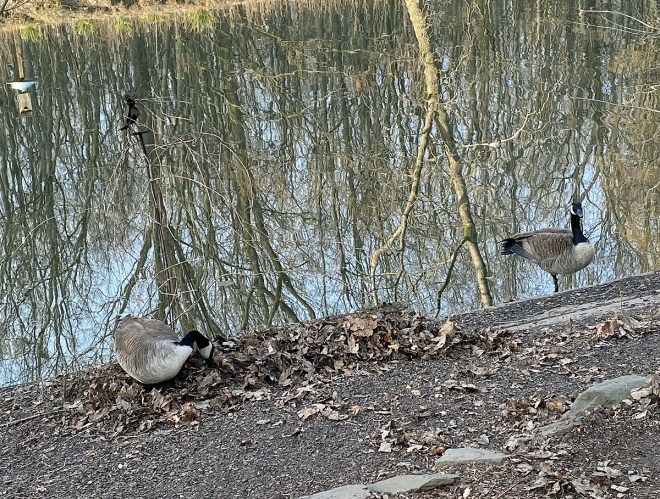 The canada geese are claiming territory for their nest and the females are starting the nest building…..