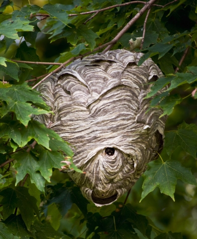 Hornets build the familiar large nests of a paper-like material made from chewed wood mixed with saliva. Nests contain many tiers of cells covered by the outer shell with a single opening at the bottom. Hornet nests are usually located in wooded areas, attached to a tree branch, but may be attached to shrubs, utility poles or house siding. Each nest has only a few hundred workers that are about an inch long and dark with white, light yellow or cream colored markings on the abdomen, thorax, and face. Hornets can be aroused to sting in great numbers, but only when the nest is disturbed or threatened.