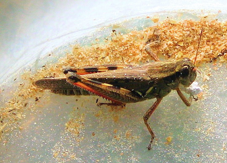 grasshopper eating in one of my bird seed container-Red-legged Grasshopper