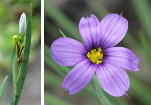 Are you looking for a striking, unusual addition to your garden? Or a splash of color during the spring to summer transition? Consider the Blue-eyed Grasses (Sisyrinchium species)! What they lack in size they certainly make up for in beauty and tenacity. If you have a well drained site in your yard that receives lots of sun, these are the plants for you. This beautiful plant blooms a star-shaped flower that opens in the morning to reveal six blueish-purple petals and a yellow center, and then will close in the afternoon or evening.