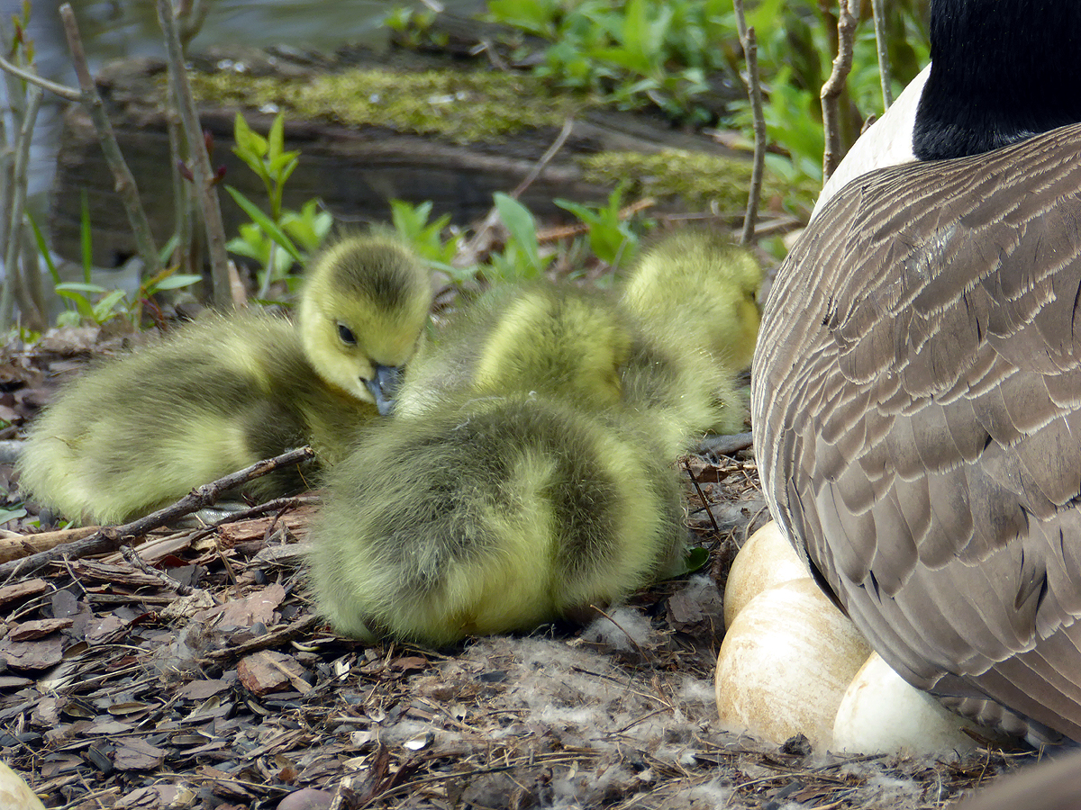 This pair I call “the gooselings” nested the first time and the nest was washed away when the pond flooded. The second year they hatched 3 goslings and it was clear that they were new as the gander-male looked startled when they went into the water and swam up to him.