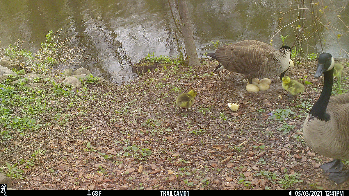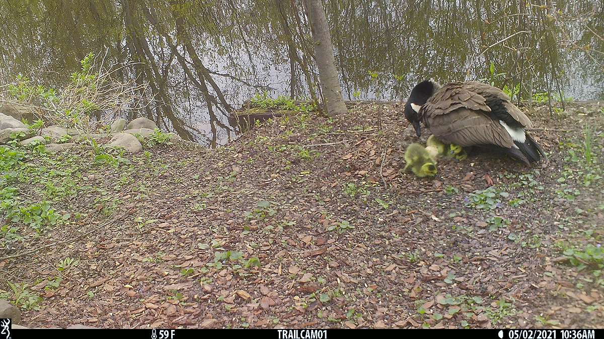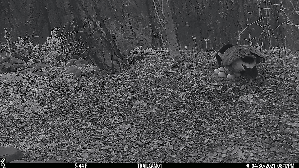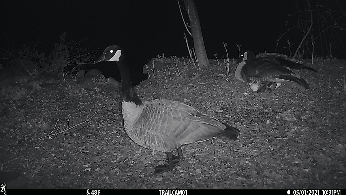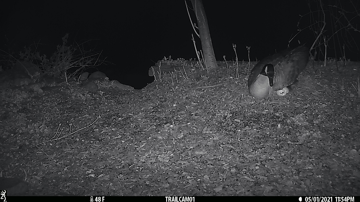 The goose rarely leaves the nest and carefully turns all the eggs frequently so they don’t stick and all stay warm. Only the female sits in the eggs. This is from my trail cam at night in my yard.